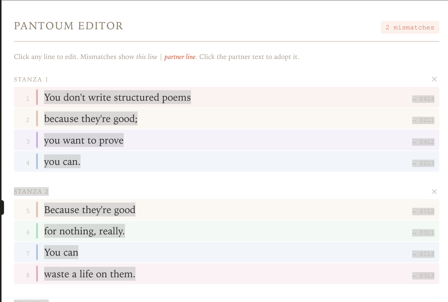But she also gave me two gifts to help me pantoumime on my own behalf. First, she – largely under her own direction – designed this Pantoum Editor that lets you easily see which lines need to match, and where you currently have mismatches, and realign them. I'm really impressed with this product, you can try it for yourself here: http://www.marbiru.com/pantoum-editor.